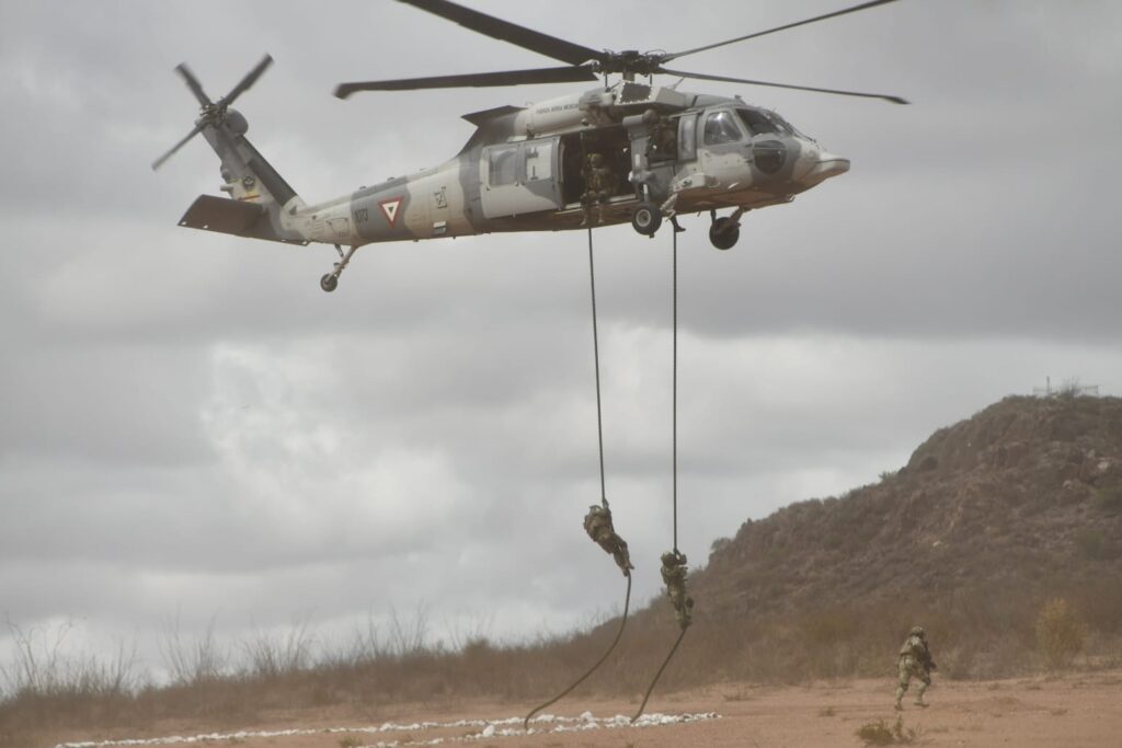 Santa Gertrudis, Chihuahua.- Personal del Ejército, Fuerza Aérea y Guardia Nacional, realizaron el ejercicio final de la 4/a. y 5/a. fase de adiestramiento, en el Centro Nacional de Adiestramiento (C.N.A.).