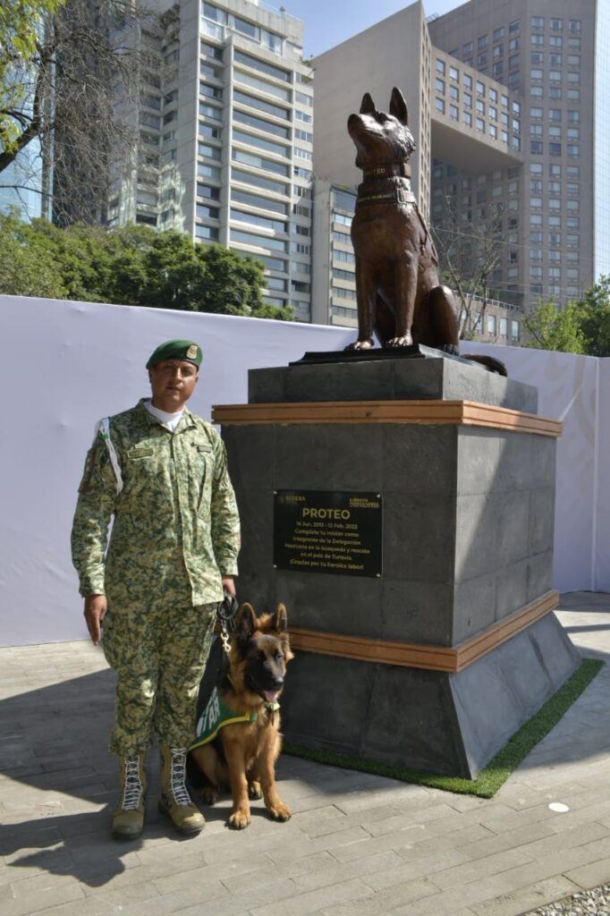 Para finalizar el evento, se realizó la develación de una estatua en honor al can Proteo y se dio lectura al texto contenido en la placa: “Proteo, cumpliste con tu misión como integrante de la delegación mexicana, en la búsqueda y rescate en el país de Turquia. Gracias por tu heroica labor”.