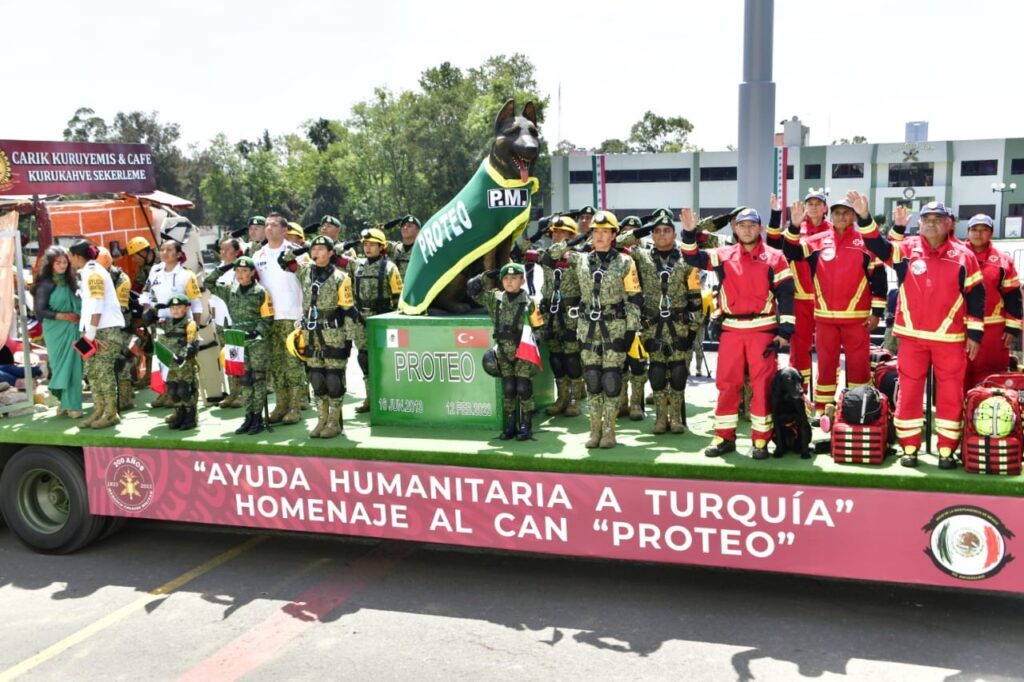 De igual forma, se apreciaron diversos carros temáticos, resaltando el que transportaba una estatua del can Proteo, quien perdió la vida en el cumplimiento de su deber rescatando personas en Turquía; así como el del cachorro Arkadas, donado en agradecimiento a nuestro país por el pueblo turco, mismo que continúa con el legado de su antecesor adiestrándose en la especialidad de búsqueda y rescate.