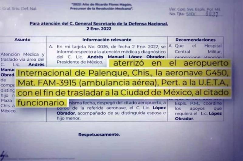 Lo anterior se registró el pasado el 2 de enero del año en curso, cuando el mandatario se encontraba estaba en su rancho, de donde fue trasladado una base militar para de ahí ser movilizado en ambulancia aérea a la Ciudad de México y luego llevado en un helicóptero al Hospital Central Militar.